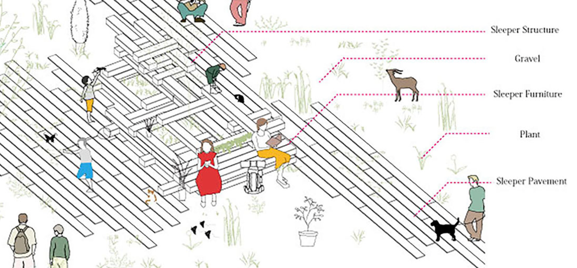 枕木という鉄道廃材を建材として用い、木架構の新しい駅舎と線路沿いのランドスケープを考える。 全国的に見ても駅舎(沿線)の建築年数は既に寿命を迎えているが、時代から淘汰されつつある全国のワンマン鉄道は主要鉄道と比べ、残された時間も資金も対象的である。そこで全く新しくつくるのではなく、ストックを利用した独自の駅舎建て替えを提案する。既に時間を身に纏った枕木は、コンクリートや鉄でできた駅舎にはない温かみと落ち着きのある景観をまちに提供すると同時にヒューマンスケールのモジュールで人はもちろん動植物や昆虫など多くの生命のやどりしろを形成する。さらに枕木を使った駅舎開発は廃線後の舗装やランドスケープの形成に有効に使用できるという側面も備え、一次的生活動線や公園などの公共空間開発の可能性を示唆する21世紀のオーガニックアーキテクチャとなる。